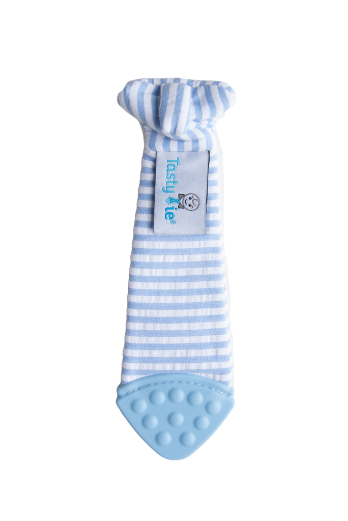Tasty Tie® is the world's first wearable baby teething tie. The tie is a stylish solution that prevents the constant dropping of most teething toys. It provides all day access for babies who want to soothe their sore gums or just play with it to hear that stimulating crinkle sound. The tie clips on safely and securely to any baby outfit, providing endless entertainment!